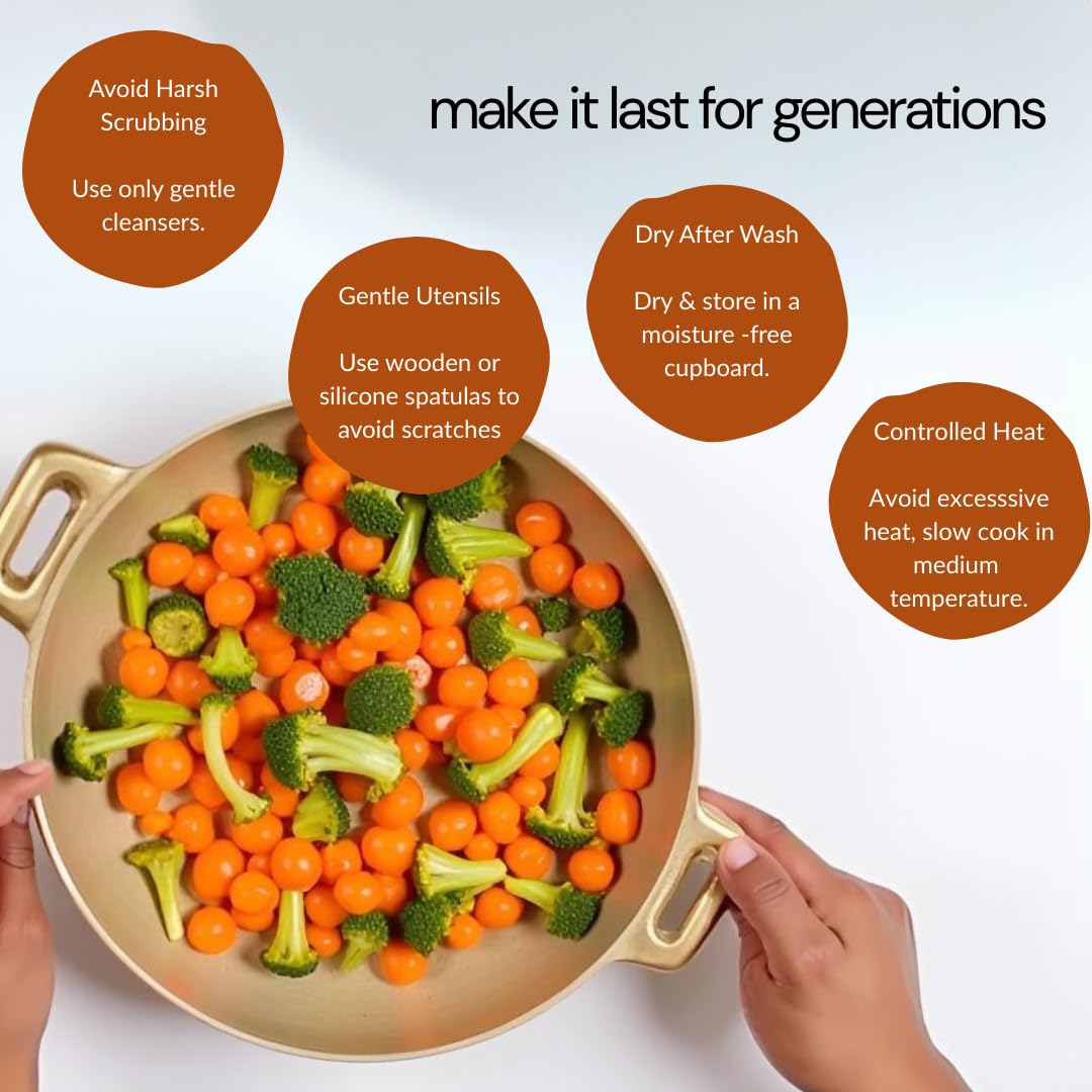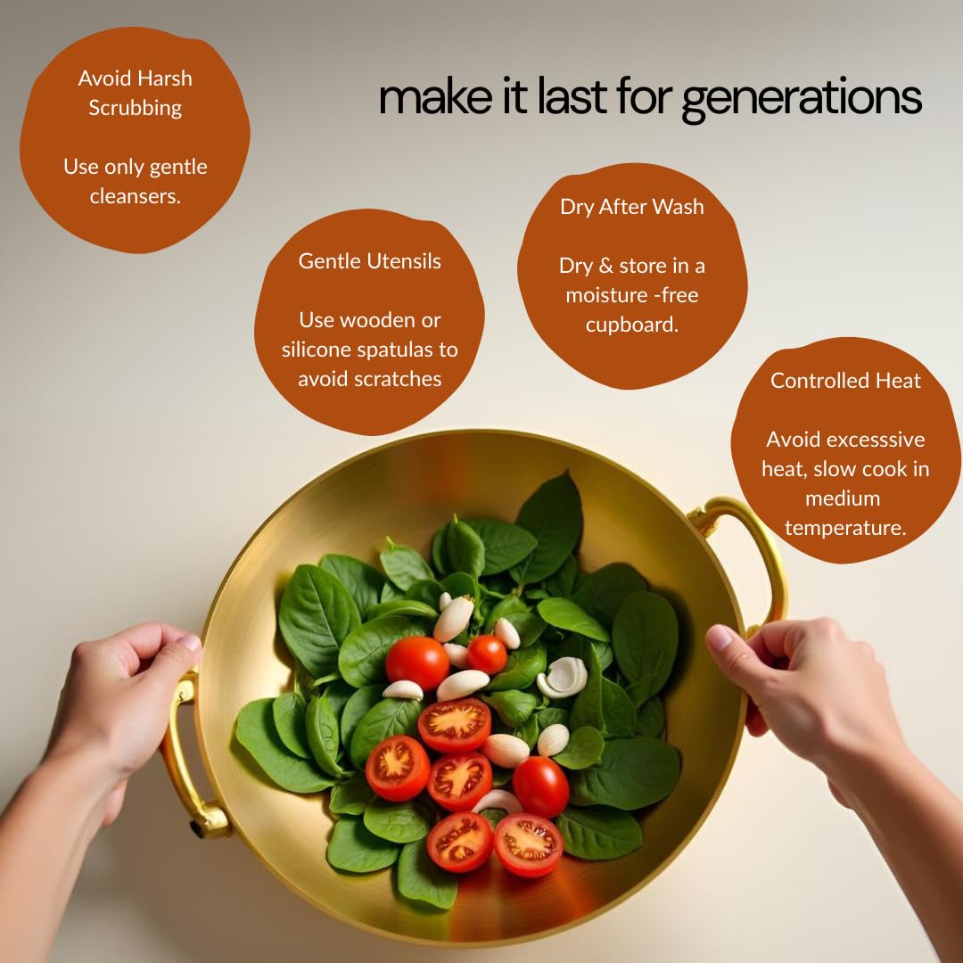 - High-Quality Bronze Construction: Both the frying pan and kadai are crafted from durable bronze, ensuring excellent heat distribution for evenly cooked meals and long-lasting use.