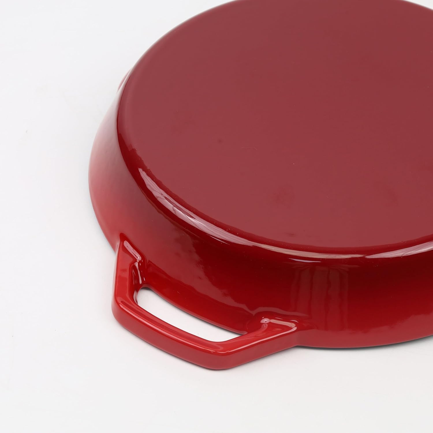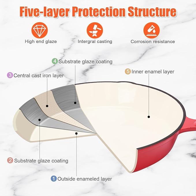 - STRIKING APPEARANCE: Beautiful red exterior enamel finish adds a pop of colour to your kitchen while protecting the cast iron core