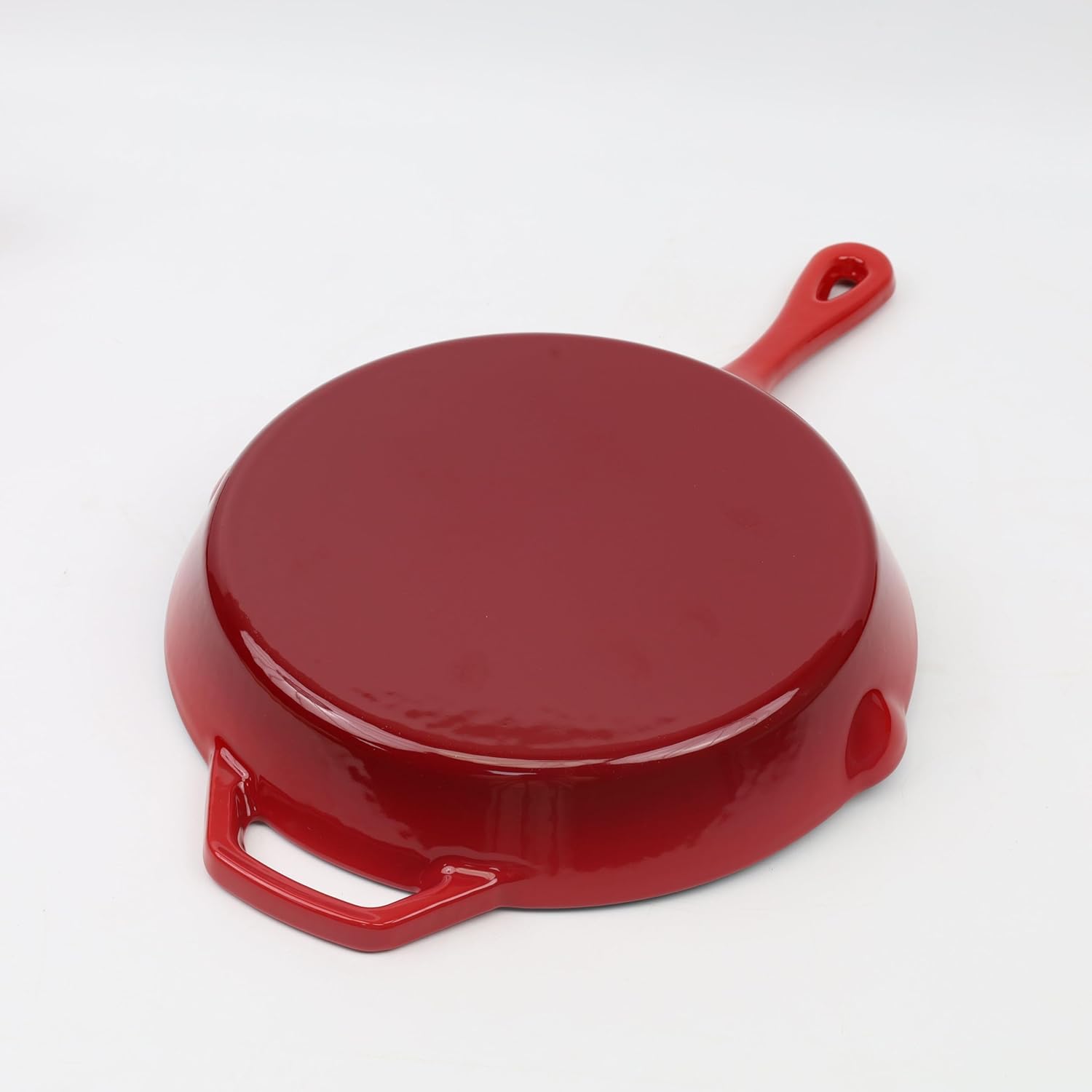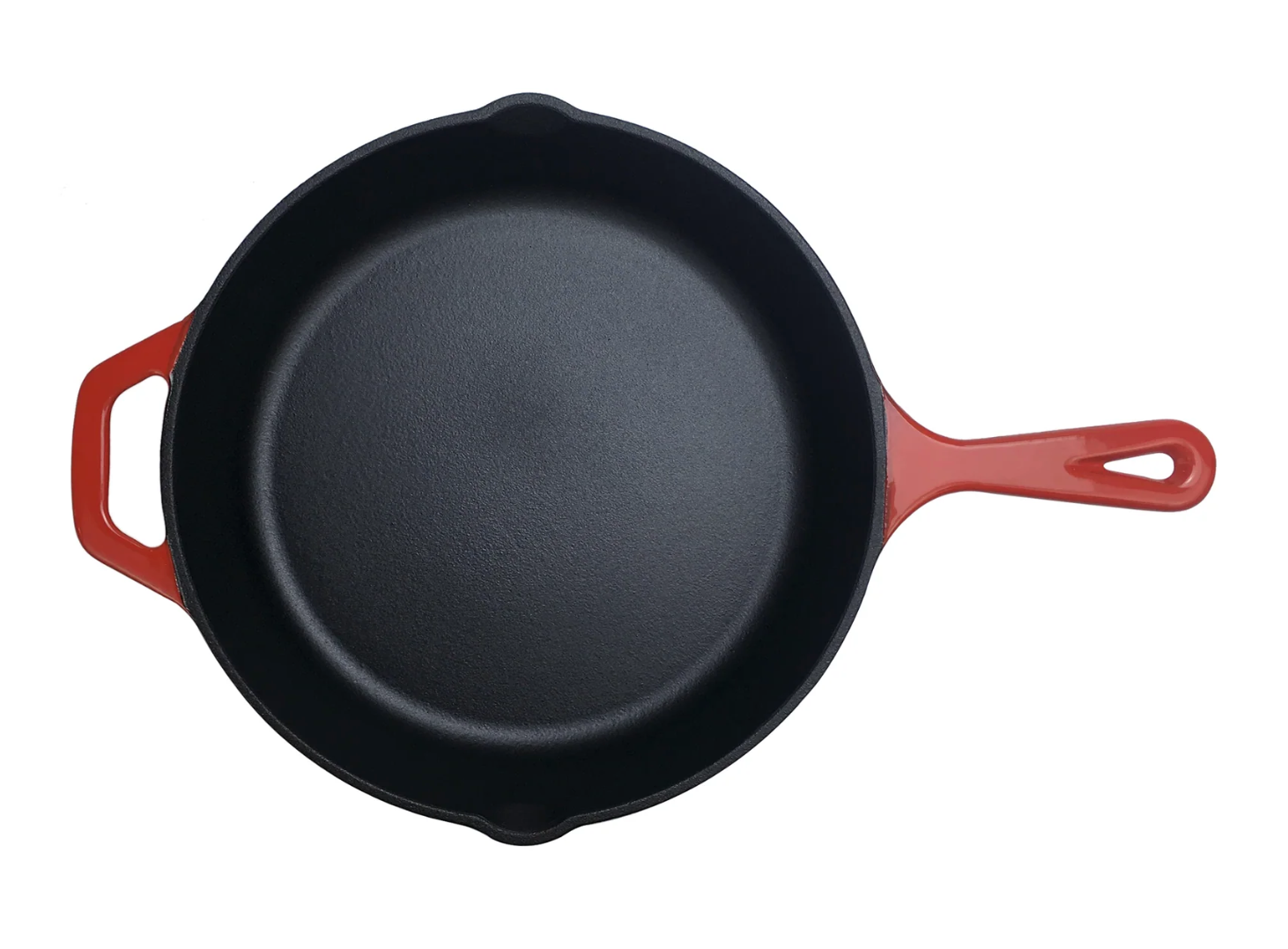 Elevate your cooking experience with this stunning 30 cm cast iron frying pan featuring a beautiful red exterior finish and cream-coloured enamel interior. The durable cast iron construction ensures excellent heat retention and distribution, making it perfect for searing, frying, and sautéing. The smooth enamel interior prevents food from sticking and makes cleanup a breeze, while eliminating the need for seasoning. The generous size accommodates family-sized portions, and the long handle provides comfortable control during cooking. This versatile pan works seamlessly on all cooktop types, including induction, and can withstand high temperatures in the oven. The helper handle on the opposite side offers additional support when lifting or transferring. The pan's elegant design makes it suitable for both cooking and serving, transitioning beautifully from stovetop to table. The robust construction ensures this pan will be a lasting addition to your cookware collection, perfect for creating countless delicious meals.